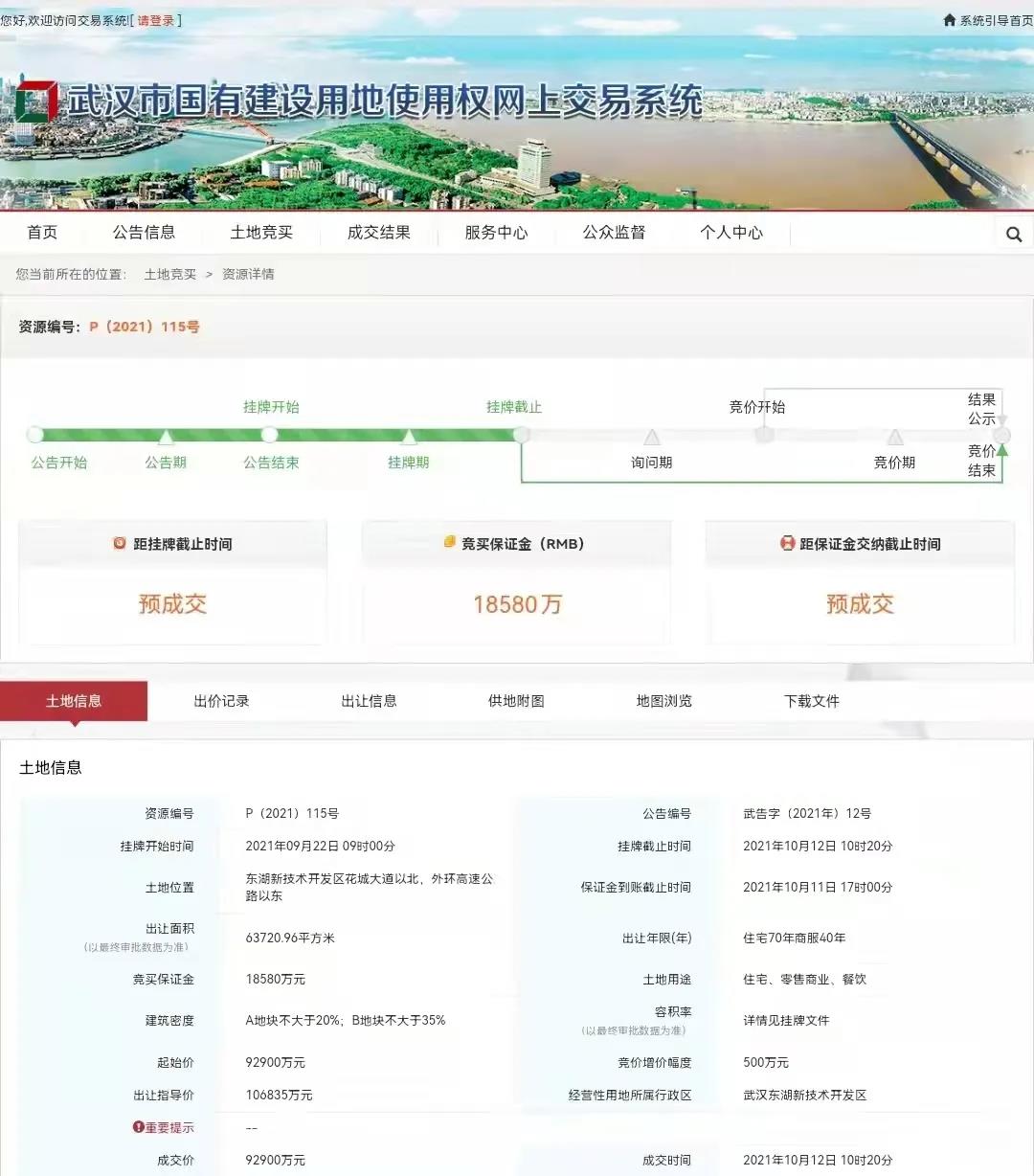 10月12日,在武汉市第二次集中供地中,位于花山生态新城的P(2021)115号地块成交,成交总价9.29亿元,综合楼面价11214.76元/平米。