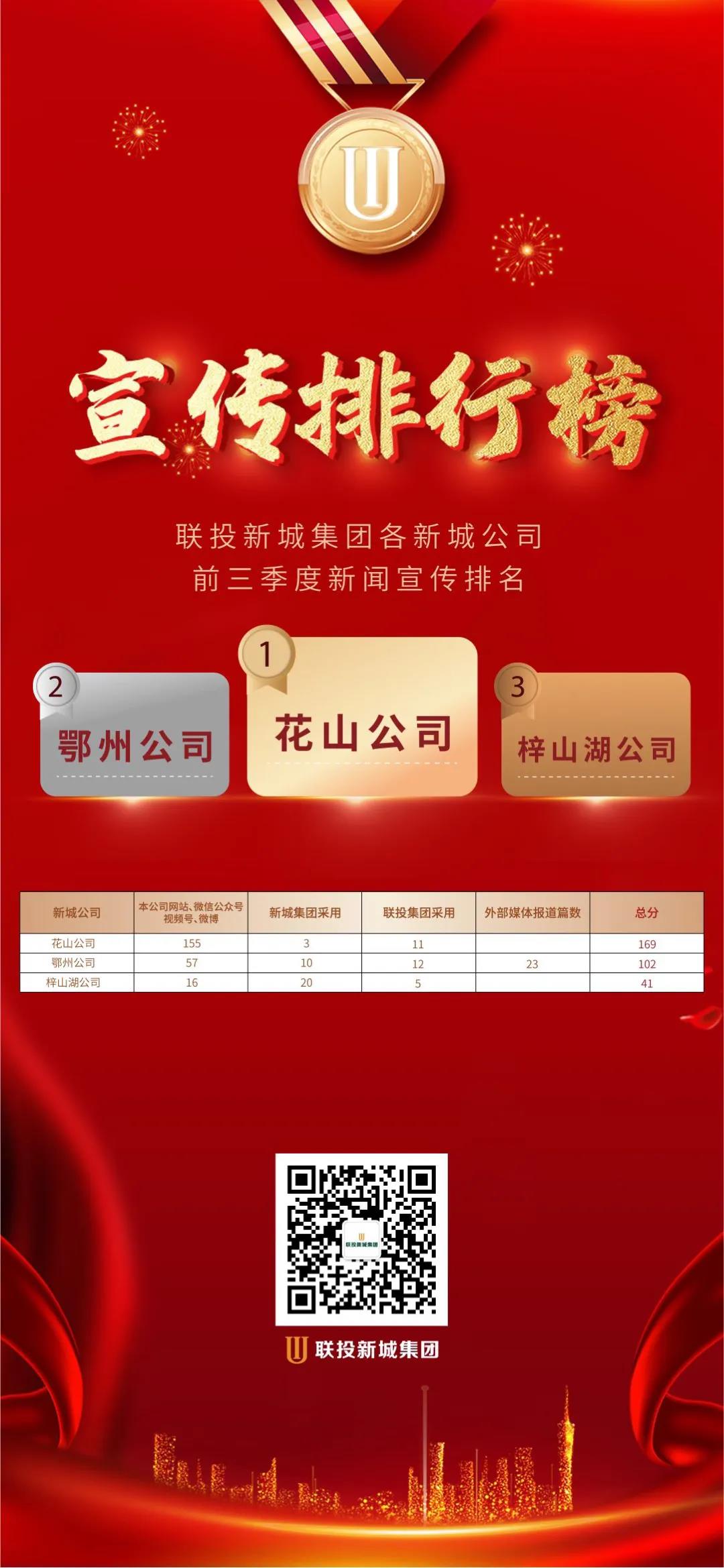 为进一步做好新城集团宣传工作,提升各新城公司对国有企业加强宣传工作重要性的认识,新城集团以结果为导向,加大宣传工作绩效考核力度,对各新城公司前三季度宣传发稿数量进行统计并发布前三名排行榜。据统计,截止至10月20日,花山公司前三季度发稿总量为169篇,得分169分,其中本公司宣传渠道发稿数量为155篇,新城集团采用3篇,联投集团采用11篇,排名第一;鄂州公司(含梧桐湖公司、华容公司)发稿总量为102篇,得分为102分,其中本公司宣传渠道发稿数量为57,新城集团采用10篇,联投集团采用12篇,外部媒体报道为23篇。梓山湖公司公司发稿总量为41篇,得分为41分,其中本公司宣传渠道发稿数量为16,新城集团采用20篇,联投集团采用5篇。