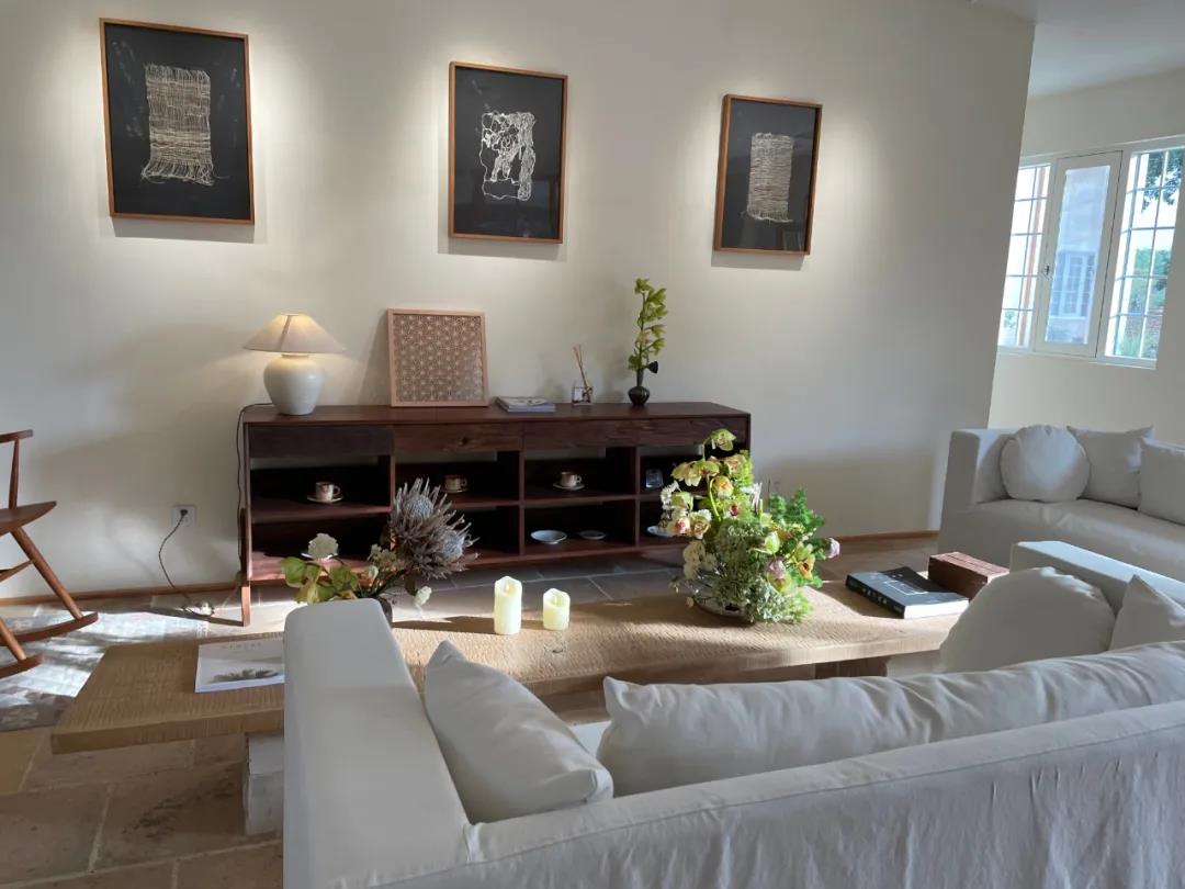 咸宁店房间内的装饰挂画都来自weavewave工作室。咸宁有产亚麻的传统,设计师结合羊毛等天然材料,手工织物体现的质朴和美感让空间温暖柔和。