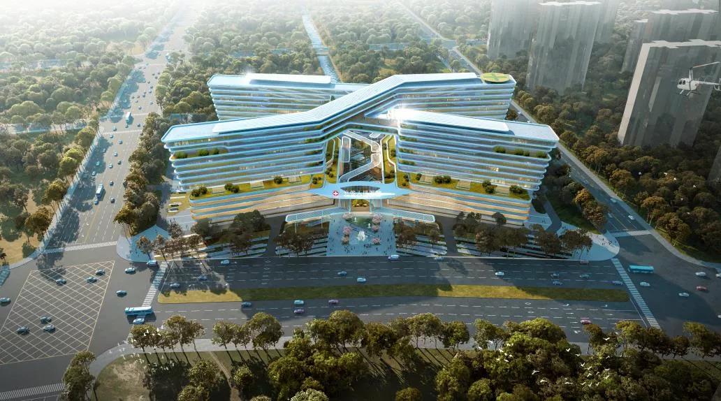 医院主体建筑造型源于X、Y基因形式,象征生命、健康的律动,也形似电子电路的连接,彰显光谷电子信息和生命大健康两大产业特征,整体外观完全融入花山生态新城自然景观,设计凸显生态化、舒适化、科技化。