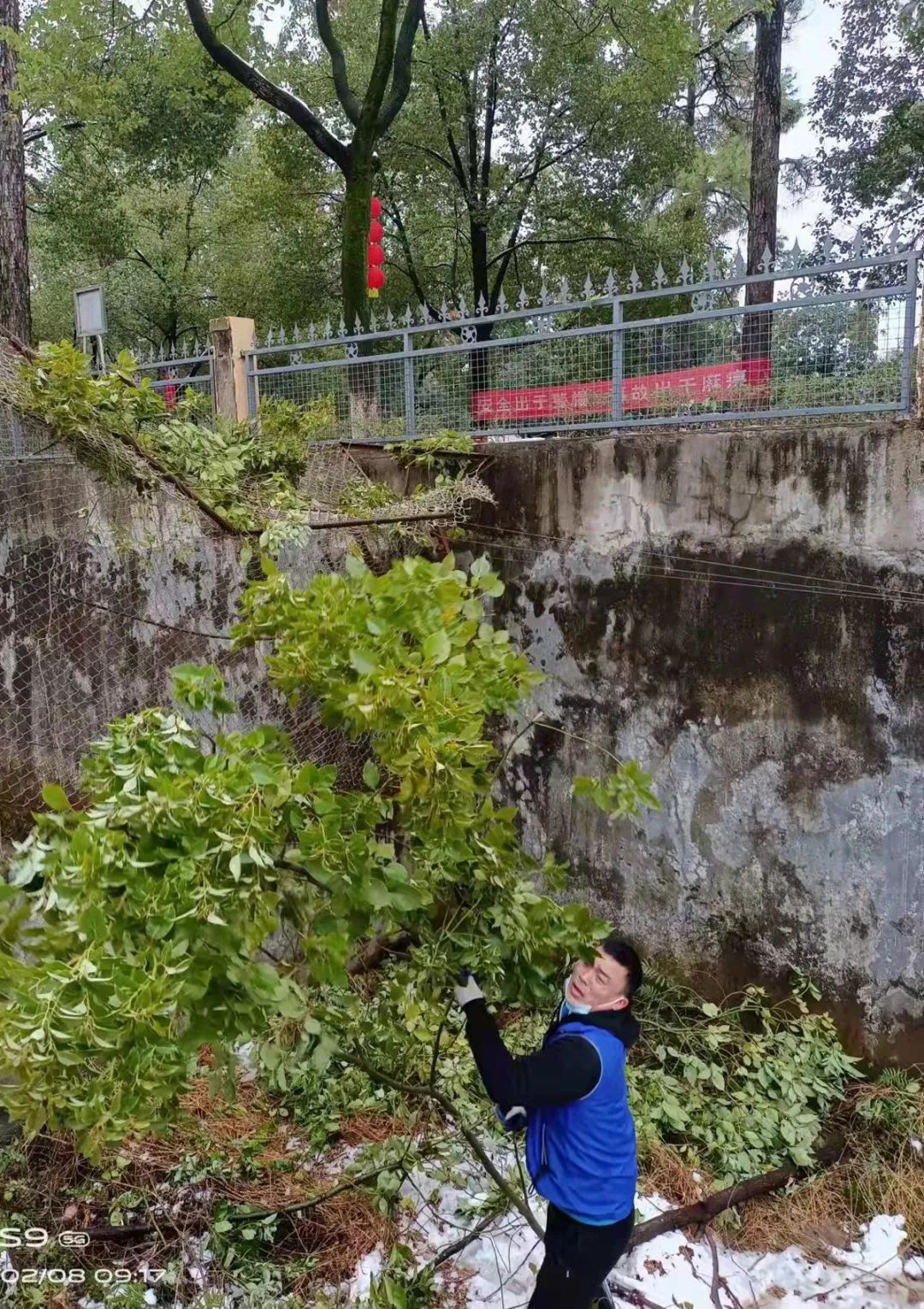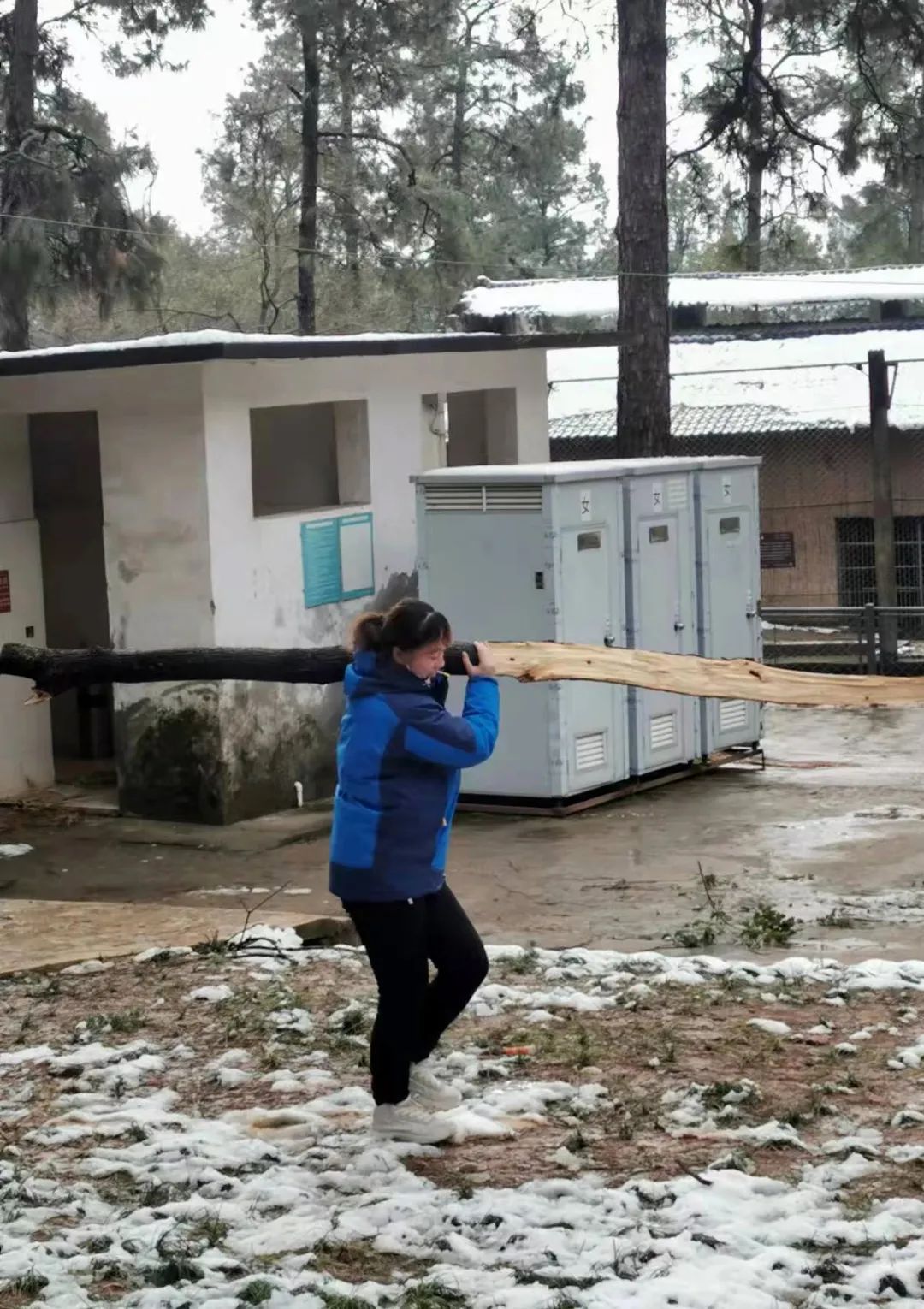 他们第一时间将所有动物都收在内笼舍,以免动物逃逸或受到伤害,同时通过公众号、告示等积极发布临时闭园通告,规避游客游园安全风险;然后全力投入对损坏设施的统计、记录及安全隐患排查,将所有人员分成4队,分别对全园电网、监控、电路、外接电线、管道等进行检修、拆除、清理动物笼舍、动物活动场及修复部分外活动场围挡、围栏,维修幼狼舍顶棚等,经过大面积清理、粉碎断裂的树干、树枝约50立方。